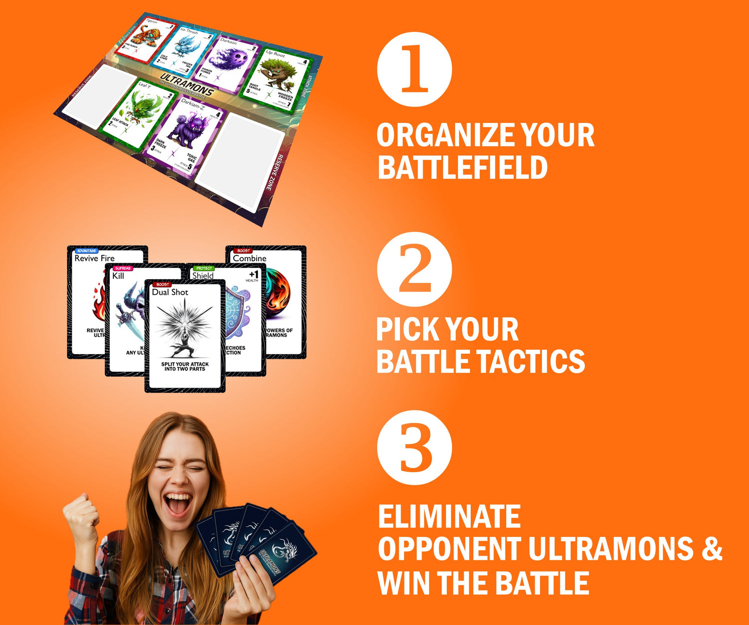 Enter the world of Ultramons where Nature, Fire, Water, and Poison monsters clash in fast-paced, strategic card battles. Use tactical positioning, surprise powers, and smart combos to outplay your opponent. The perfect game for family game nights, with kids and adults.