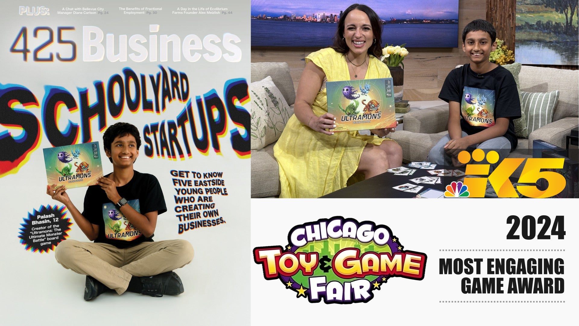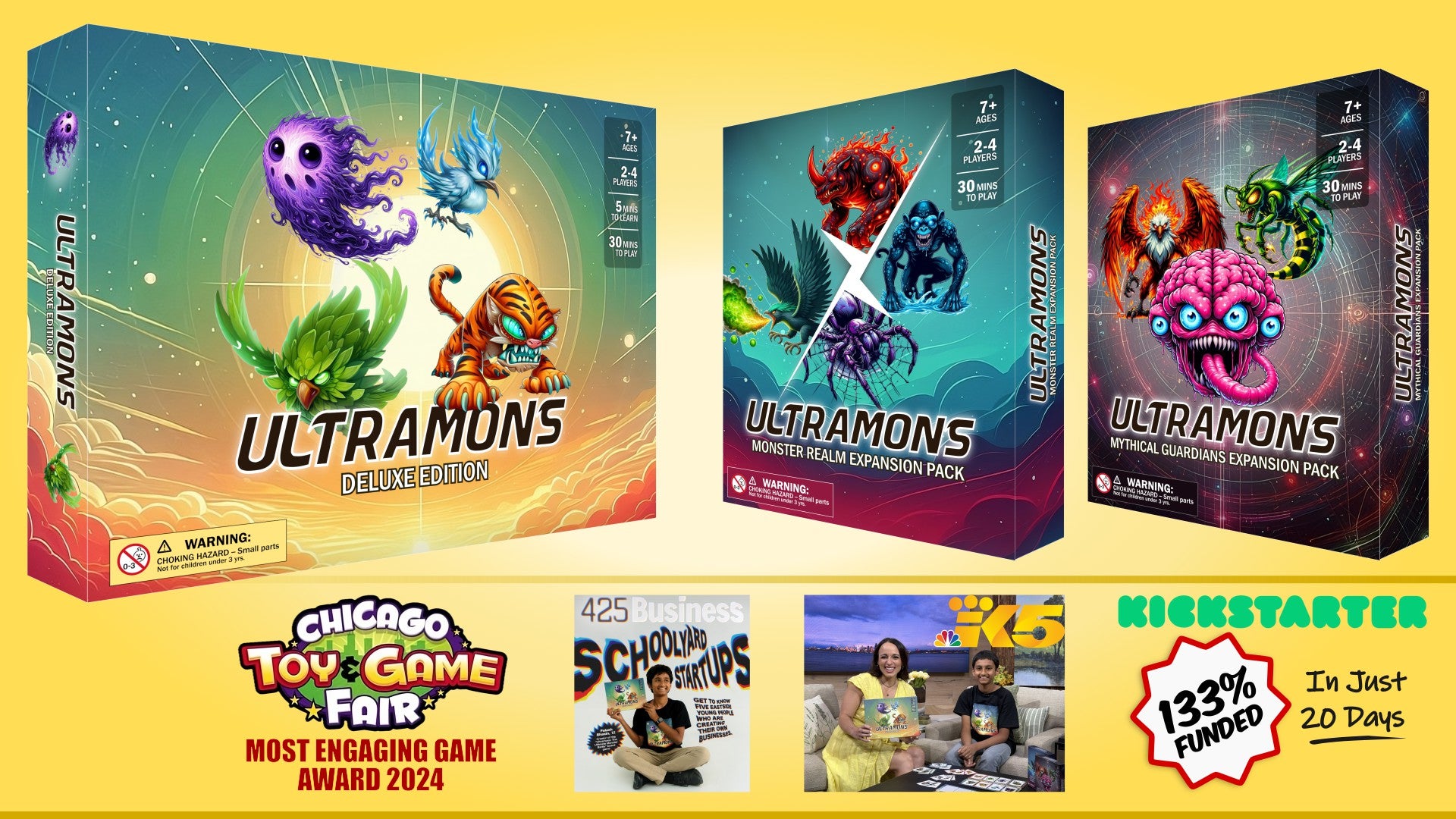 Ultramons was invented by 10-year-old Palash after a move separated him from his favorite games. This kid-created game became a Kickstarter success in 2024 with 133% funding, won the “Chicago Toys & Games Fair” award, and was featured on national TV for its creativity and impact.